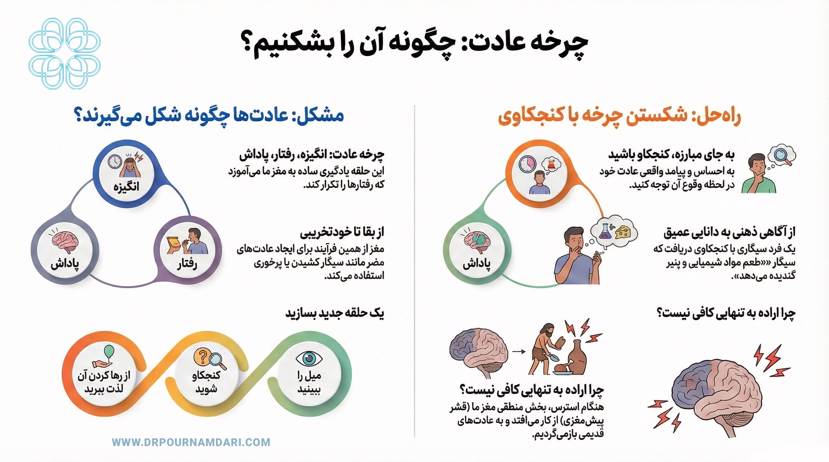 این تفاوت حیاتی میان دانستن چیزی و دانستن آن است. او همیشه به صورت فکری می‌دانست که سیگار برایش مضر است، اما حالا واقعیت آن را در بدنش حس می‌کرد. این سرخوردگی عمیق و درونی همان چیزی است که طلسم عادت را می‌شکند؛ این تجربه ارزش پاداش رفتار را در مغز از مثبت به منفی تغییر می‌دهد.