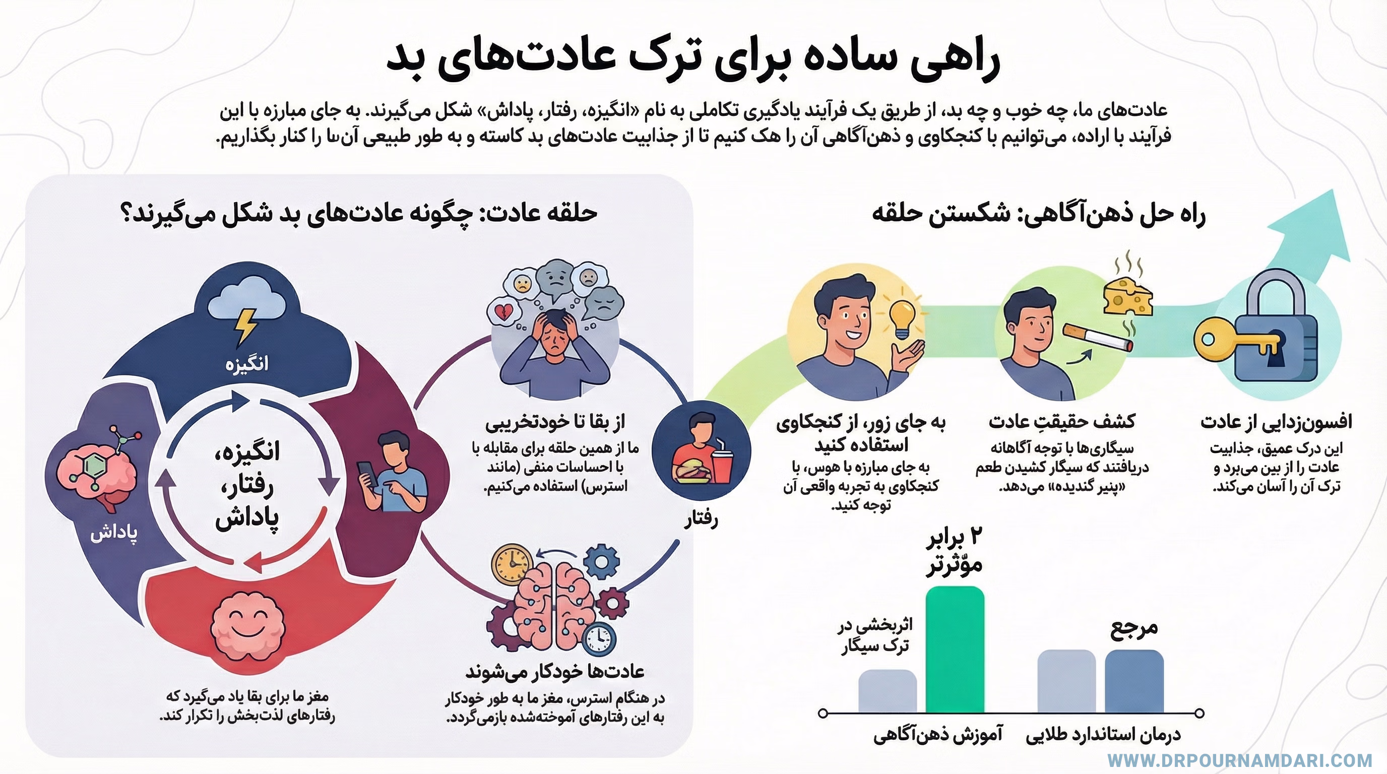 متأسفانه، همین حلقه قدرتمند برای ایجاد عادات بد نیز به کار گرفته می‌شود. وقتی احساس غم یا استرس می‌کنید (محرک)، چیزی شیرین می‌خورید (رفتار)، و برای مدتی کوتاه احساس بهتری پیدا می‌کنید (پاداش). مغز شما یاد می‌گیرد که دفعه بعد که چنین احساسی داشتید، همین کار را تکرار کنید. به این ترتیب، یک عادت شکل می‌گیرد که ریشه در عمیق‌ترین مدارهای بقای ما دارد.